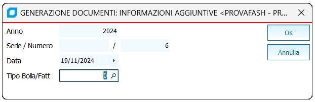 - Infine si procede all'elaborazione premendo l'apposito tasto 'Genera ordine' e compilando la finestra che richiede gli estremi del documento da creare.