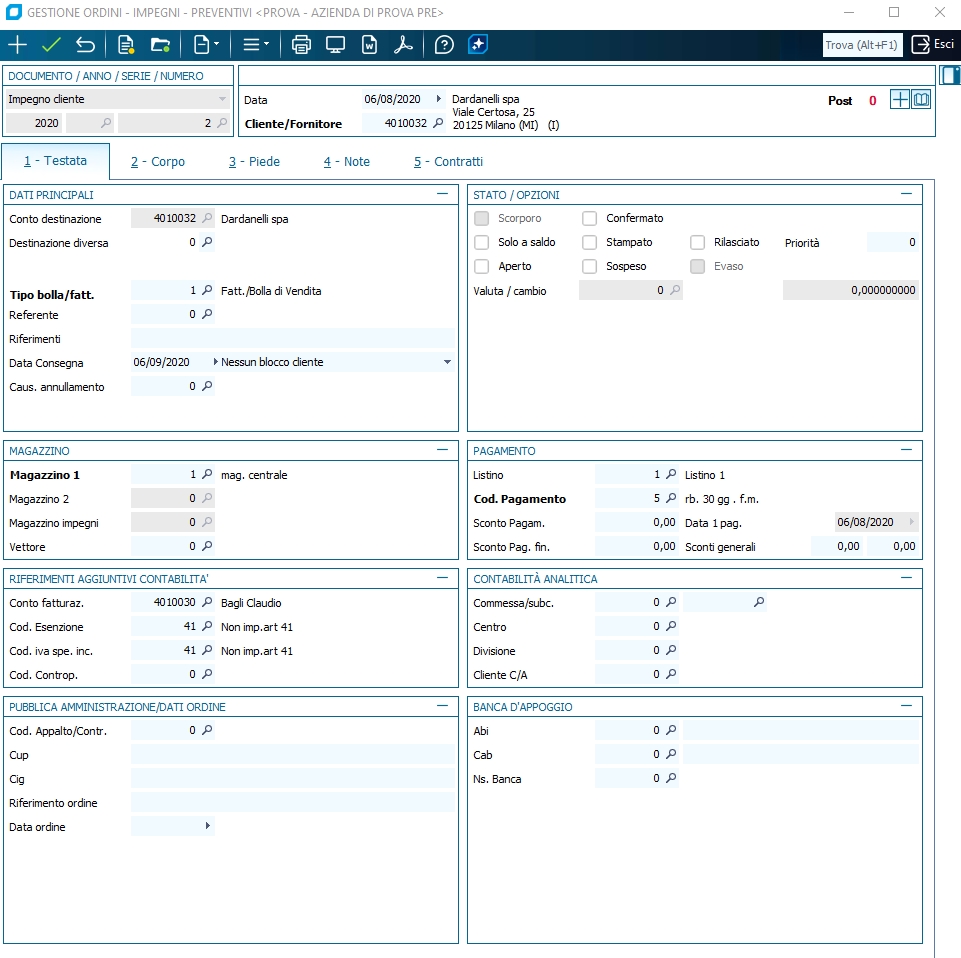 Codice di Pagamento Il codice pagamento è proposto dalle impostazioni/anagrafica conto, poiché la funzionalità di lettura del conto di testata è in comune con Gestione documenti di magazzino. La denominazione del campo del Codice Pagamento in grassetto indica che il dato è importante ma non obbligatorio: azzerandolo, il salvataggio è comunque consentito, a differenza di Gestione documenti.