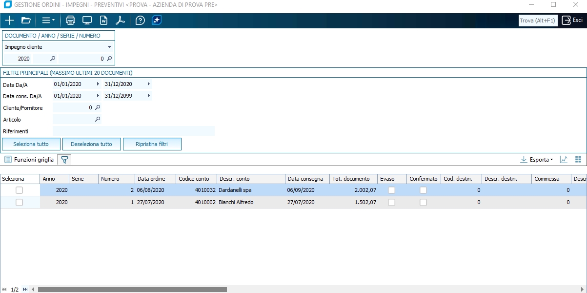 CTRL+F4 (mostra precedenti ordini) quando si è posizionati su una riga del corpo, mostra se ci sono altre righe d'ordine da evadere per quel fornitore/cliente o per quel articolo / fornitore o articolo / cliente. Il programma mostra solo le righe inevase.