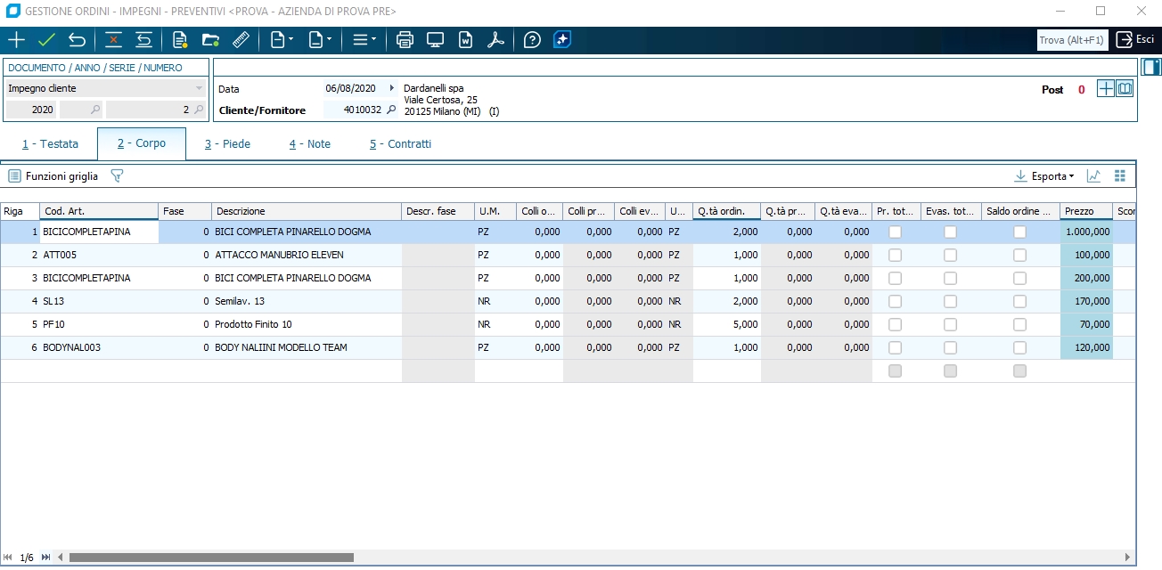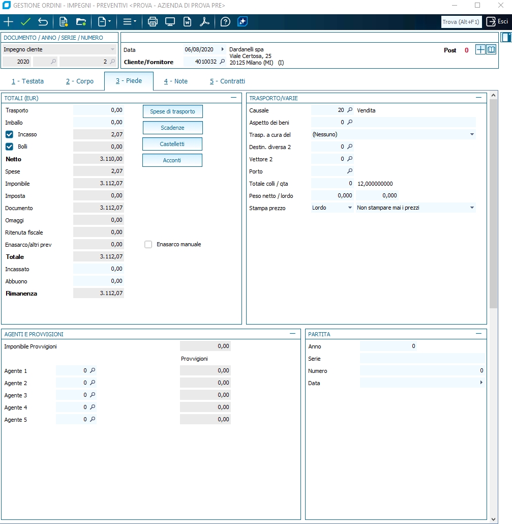 In assenza dei due moduli sopra indicati, è possibile richiamare il Preventivo all'interno di un Impegno cliente ed eliminare una riga del preventivo, quindi è possibile evadere parzialmente il preventivo a livello di riga, ma non di quantità. Esemplificando, se ho un preventivo con q.tà 10, posso evaderlo in un Impegno cliente solo per la stessa q.tà.