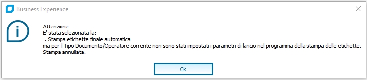 Stampa etichette finale automatica evitando di aprire il programma Stampa etichette articoli, viene eseguita direttamente la Stampa etichette articoli ed è alternativa alla Stampa etichette finale (se viene selezionata una di queste voci automaticamente si deseleziona l'altra). Sono stampate automaticamente le etichette come da configurazione salvata in stampa etichette con l'apposita funzionalità da menù Strumenti "salva impostazioni per tipo documento/operatore". Se non è stata salvata l'impostazione relativa, in fase di stampa report/PDF, sarà visualizzato il seguente messaggio e la stampa non sarà eseguita: