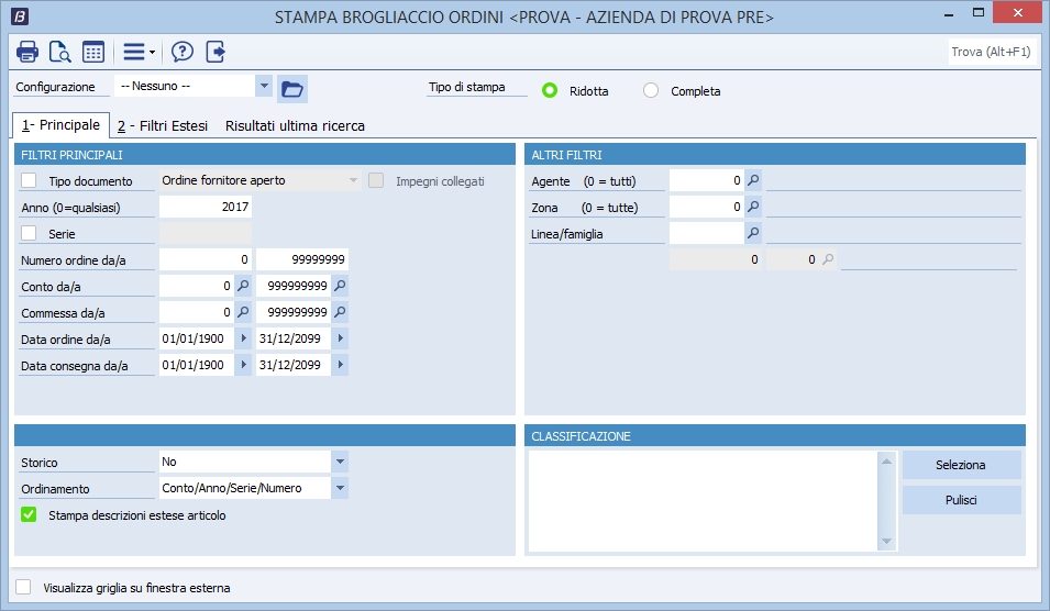 Moduli richiesti: Commerciale Avanzato Questo programma stampa gli ordini ai fornitori e gli ordini dei clienti su tabulato, a fini di controllo sull'archivio degli ordini clienti / fornitori. Oggetto della stampa sono gli ordini e gli impegni, o i preventivi, in quanto documenti. Pertanto i filtri qui indicati sono da intendersi relativi ai dati di testata o piede, non delle singole righe.