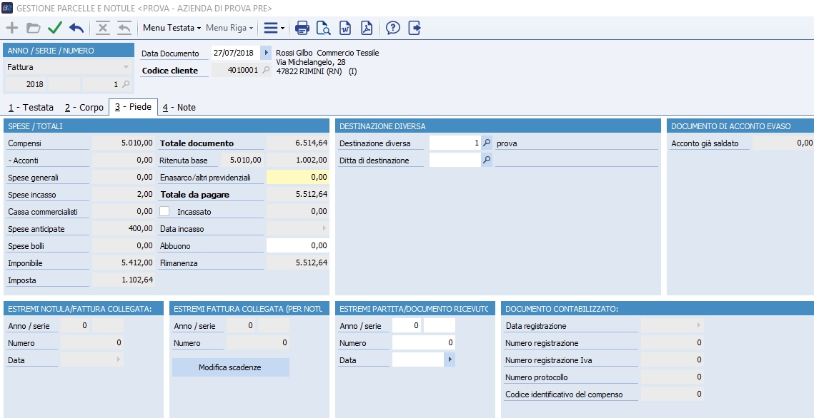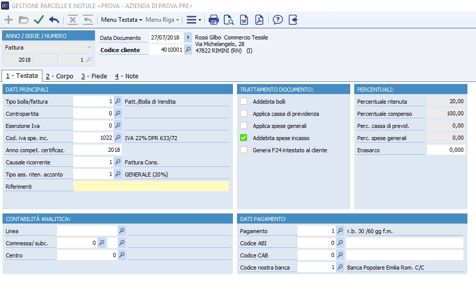 Le funzioni di menu prevedono la possibilità di emettere nuovi documenti e aprire per modificare o cancellare documenti esistenti. Le funzioni di stampa consentono elaborazioni su carta o di anteprima a video. Se si lavora con Microsoft Word, è anche possibile generare documenti in base a modelli Word preimpostati, col vantaggio di poter modificare il file creato, sebbene le variazioni eseguite sul file di Word non abbiano alcuna ripercussione sui dati inseriti prima della stampa. Le voci di attività da inserire dei documenti possono essere digitate manualmente o prelevate dall'archivio "Gestione attività", in cui dovrebbero essere state inserite in precedenza, all'atto dell'effettuazione della prestazione. In entrambi i casi non possono essere selezionate voci di tipo "Cassa commercialisti", "Spese generali" e "Spese anticipate dal cliente". Le attività di tipo "Acconto" possono essere utilizzate solo nei documenti di tipo "Fatture di acconto", poichè in questo tipo di documento si può inserire una sola riga nel corpo e non possono essere addebitate spese accessorie. Testata In questa sezione sono inserite o modificate le informazioni principali del documento che dev'esser generato o modificato. Alcuni di questi campi, ad esempio il codice del cliente, sono bloccati quando nel corpo del documento sono state inserite delle voci.