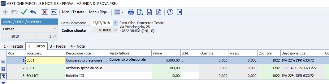 Riga Compilato in automatico, ogni riga è contrassegnata da un numero univoco. Voce di parcellazione Indicare l'attività da addebitare al cliente. Descrizione voce Una volta selezionata la voce di parcellazione, è compilata con la descrizione della voce stessa. Può essere modificata per personalizzare il testo da riportare sul documento. Testo fattura Se la voce di parcellazione, nella sua anagrafica, ha spuntato "Eredita testo in righe documenti" questo campo è compilato col testo fattura inserito nell'anagrafica della voce. Può esser modificato direttamente nella casella della griglia, oppure è possibile utilizzare la voce di menu Strumenti - Modifica testo fattura, per la quale non occorre essere sulla cella del testo fattura, basta essere sulla riga con testo da variare. Valore Inserire il valore da addebitare al cliente. Questo campo è modificabile solo se nella tabella delle voci di parcellazione, come "Voce di imputazione", è selezionato "Valore" o "Quantità e valore". U.M. É compilata in automatico in base al valore indicato nella tabella della voce di parcellazione. Quantità Inserire la quantità da utilizzare per moltiplicare il prezzo per determinare il valore della prestazione eseguita. Questo nel caso di impostazione "Voce di imputazione" su "Quantità e prezzo" nel programma "Voci di parcellazione". Diversamente il campo è solo informativo o non modificabile. Prezzo Inserire il prezzo da addebitare al cliente. Prezzo per quantità determina il numero che sarà impostato nella colonna valore. Questo campo è modificabile solo se nella tabella delle voci di parcellazione, come "Voce di imputazione", è selezionato "Prezzo e quantità". Sconti Generali Si intendono quelli applicati sul totale della merce (imponibile) senza distinzione di articolo. Codice/descrizione IVA Indicare il codice IVA da utilizzare per la voce di parcellazione indicata. Codice/descrizione Contropartita Indicare il codice di contropartita da utilizzare, in fase di contabilizzazione documento, per assegnare il giusto sottoconto al ricavo da addebitare. Linea CA Con Contabilità analitica attiva, se il codice di contropartita punta ad un conto di costo/ricavo che prevede l'imputazione della linea, se la causale di mazzino utilizzata ha un flag di contabilità analitica Dare o Avere, indicare il codice identificativo della linea di prodotto o di produzione a cui il costo/ricavo espresso da questa riga deve confluire, per le elaborazioni di contabilità analitica. Commessa C.A Con contabilità analitica, se il codice di contropartita punta ad un conto di costo/ricavo che prevede l'imputazione della commessa, se la causale di magazzino utilizzata prevede Dare o Avere nel campo 'Test C.I.', indicare il codice identificativo della commessa a cui il costo/ricavo espresso da questa riga deve confluire, ai fini delle elaborazioni di contabilità analitica. Sottocommessa Identificativo della sottocommessa relativa al campo precedente. Conto CA Indicare il codice conto, scelto tra i sottoconti di CA, a cui il codice contropartita farà riferimento. Centro di C.A. Con contabilità analitica, se il codice di contropartita punta ad un conto di costo/ricavo che prevede l'imputazione della commessa, se la causale di magazzino utilizzata prevede Dare o Avere nel campo "Test C.I.", indicare il codice identificativo del centro di costo/ricavo a cui il costo/ricavo espresso da questa riga deve confluire. É proposto il centro associato al tipo bolla/fattura e memorizzato nella cartella Altri Dati; se presente sull'anagrafica articoli un cod. centro, questo è proposto all'utente con priorità su quello indicato nella cartella Altri Dati. D ata in. competenza economica - D ata fi. competenza economica Se il conto ha l'indicazione in anagrafica di gestire la data di competenza economica o il periodo di competenza economica (tipicamente conti che rappresentano costi e ricavi), occorre indicare la data che definisce il periodo o la data di riferimento per la generazione di ratei, risconti o costi/ricavi anticipati. Tipo / anno / serie / numero doc. fatt. acc. Se la riga è stata generata dalla selezione di un documento di acconto emesso in precedenza, in queste colonne sono riportati gli estremi di tale documento. Tipo riga parcellazione Riporta il tipo di riga indicato nella tabella delle voci di parcellazione per la voce in analisi. Piede