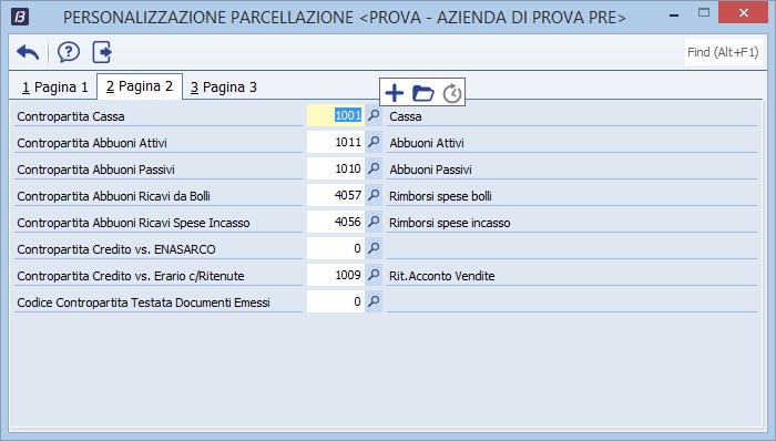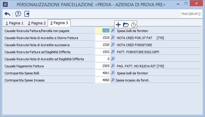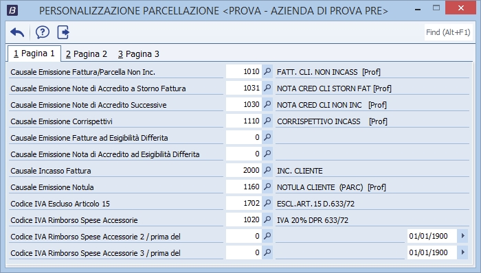 Causale emissione fattura/parcella non incassata Indicare la causale contabile da utilizzare per contabilizzare l'emissione di una parcella attiva, non incassata. Causale emissione nota d'accredito a storno fattura Indicare la causale contabile da utilizzare per contabilizzare l'emissione di una nota di accredito a cliente a storno fattura. Causale emissione note d'accredito successive Indicare la causale contabile da utilizzare per contabilizzare l'emissione di una nota d'accredito a cliente per prestazione già incassata, successiva al pagamento della parcella originaria. Causale emissione corr i spettivi Indicare la causale contabile da utilizzare per contabilizzare l'emissione di un doc. Di tipo corrispettivo. Causale emissione fattura ad esig. differita Al momento non gestito. Causale emissione nota ccredito con iva ad esig. differita Al momento non gestito. Causale incasso fattura Indicare la causale contabile da utilizzare per contabilizzare l'incasso di una parcella/fattura a cliente. Causale emissione notula Indicare la causale contabile da utilizzare per contabilizzare l'emissione di un avviso di parcella (notula) in caso di professionista che emette Ricevute bancarie su notule. Cod. Iva escl. Art. 15 Indicare il codice Iva per i rimborsi spese sostenute per conto del cliente, in particolare eventuali bolli nel piede documento. Cod. Iva Rimborso spese accessorie Indicare il codice Iva per le spese accessorie indicate nel piede del documento, ad esempio l'addebito di spese d'incasso per pagamenti di tipo RB. Pagina 2