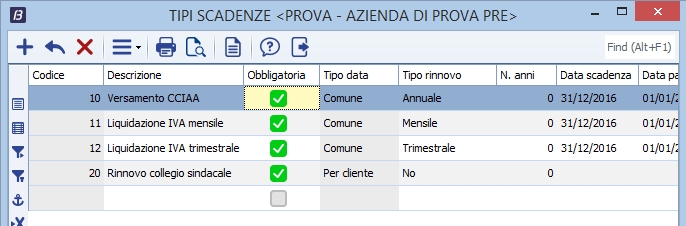Moduli richiesti: Parcellazione e Scadenzario di Studio Con questo programma è possibile classificare i vari tipi di scadenza: ad esempio, Liquidazione IVA mensile, Liquidazione IVA trimestrale, Versamento CCIAA, Rinnovo collegio sindacale, ecc.