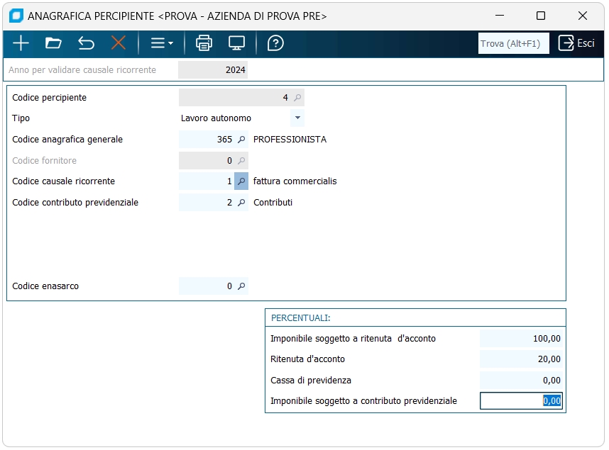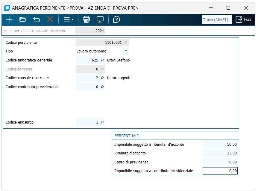 Codice percipiente É il numero identificativo del percipiente; viene proposto un numero progressivo relativo alla ditta. Può essere utile attribuire lo stesso codice dell'anagrafica fornitore a cui si ricollega, o dell'anagrafica generale, se gestita.