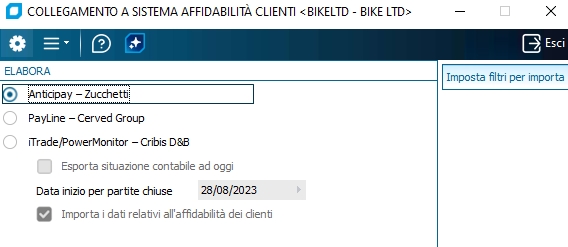 Selezionando la voce di menù "Collegam. a Sistema affidabilità clienti (da menù 2 - 2 - M)", è possibile lanciare l'importazione/esportazione dei dati.
