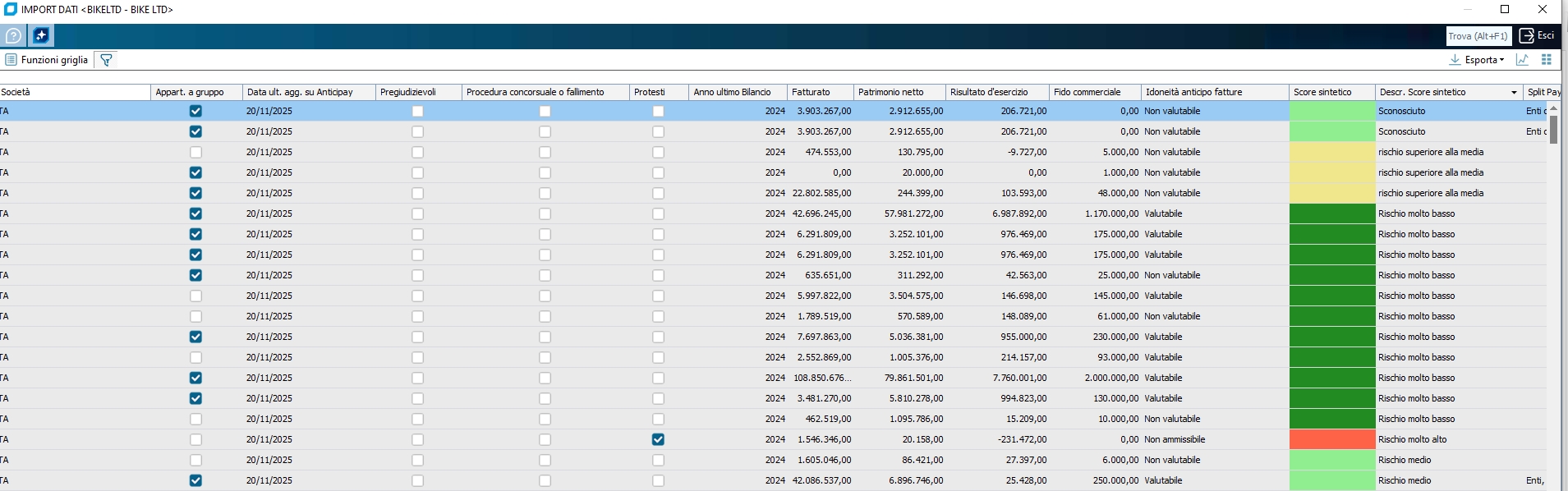 Specifiche tecniche del tracciato di scambio con PayLine di CERVED : Esportazione da Business, anagrafiche clienti (file CSV con separatore ;) - Codice Cliente (rilevato da anagra.an_conto) - Ragione Sociale (rilevato da anagra. an_descr1) - Indirizzo (rilevato da anagra. an_indir) - CAP (rilevato da anagra. an_cap) - Località (rilevato da anagra. an_citta) - Provincia (rilevato da anagra.an_prov) - Nazione (rilevato da anagra.an_stato) - Partita IVA (rilevato da anagra.an_pariva) - Codice Fiscale (rilevato da anagra.an_codfis) Non vengono esportati i clienti privati (consumatori) ossia dove in anagrafica il tipo soggetto=persona fisica / privato, e le società estere (tipo soggetto IVA=Intracee o Extracee). Saranno compresi invece i clienti RSM. Nel file non vengono esportati i dati dichiarati opzionali nel documento di Cerved "BrochureTecnica.pdf", ossia status legale, status bloccati, campi note e campi fidi. Esportazione da Business, dati contabili/scadenze (file ASCII CSV con separatore ;) Il file viene prodotto leggendo dall'archivio di prima nota (tabella PRINOT) e scadenzario (tabella SCADEN). La procedura di export opera sia con emissione di effetto con chiusura cliente che con emissione effetti senza chiusura del cliente (nel secondo caso è importante, in caso di insoluto, che prima di rilevare la registrazione dell'insoluto venga chiusa la scadenza del cliente, come se la RB fosse stata incassata regolarmente). - Codice Cliente (rilevato da prinot.pn_conto) - Data Documento (rilevato da prinot.pn_datreg) - Numero Documento = (rilevato da prinot.pn_numreg) - Data Riferimento = (rilevato da prinot.pn_datdoc, calcolato, visto che la query di partenza fa sempre una "sum" per partita, andando a cercare i numero documento dalla fattura) - Numero Riferimento = (rilevato da prinot.pn_numdoc, calcolato, visto che la query di partenza fa una 'sum' per partita, andando a cercare i numero documento dalla fattura) - Data registrazione/Numero registrazione: non valorizzati - Data Scadenza = (rilevato da scade.sc_datscad, calcolato, visto che la query di partenza fa una 'sum' per partita, andando a cercare la data scadenza più recente) - Importo = (rilevato da prinot.pn_importo) - Causale = campo calcolato con valori EF1#, EF2#, ... come sotto indicato: Per determinare i valori da passare a CERVED, la routine di esportazione segue il seguente algoritmo: - EF1# = fattura emessa (qui vanno anche gli anticipi su fattura e gli storni anticipi su fattura) - EF3# = pagato con RB/tratta (emissione effetti) - EF5# = insoluto - EF6# = pagamento quando non EF3# (compensazione partite fattura/nota cred o acconto senza fattura) - EF7# = nota cred. Cliente - EF8# = nota debito cliente - EF56# = giroconto per saldo partite/raggruppamenti La priorità di attribuzione del codice è data esattamente come sono scritti i codici sottostanti EF5: vengono impostati con questo valore tutti i movimenti on causale contabile di tipo 'insoluto' EF1: movimenti con causali contabili indicate nell'opzione di registro (facoltativa) BSPLCERV/OPZIONI/CausaleEF1# con l'elenco delle causali di CG (separate da ";") EF3: movimenti con causale 'emissione effetti' presa da personalizzazione CG EF6: movimenti di tipo 'saldo scadenze' con causale non 'emissione effetti' EF8: movimenti con causale di tipo 'nota debito' EF7: movimenti con causale di tipo 'nota credito' EF1: casi residui Può essere necessario settare l'opzione di registro CausaleEF1# per le causali utilizzare per anticipi e storno anticipi su fatture (o casi simili) Importazione da Payline (file ASCII con separatore | pipe) L'importazione prevede l'alimentazione della tabella ANACERV posta in uno-a-uno sulla tabella delle anagrafiche clienti di Business. Tutti i dato in tale sono a solo scopo informativo in Business. Prima di avviare l'elaborazione occorre impostare l'opzione di registro BSPLCERV/OPZIONI/CodFornCerved con il codice fornito da cerved (UNO PER OGNI DITTA DI BUSINESS che deve scambiare i dati) I files generati vengono salvati nella dir \ASC del pc locale. Una loro copia viene salvata anche sotto \ASC\ CERVED_STORICO\ con in più la data di generazione. Una volta generati i files, se elaborazione avviata manualmente i files vengono mostrati a video. Vengono esportati tutti i clienti italiani e rsm NON PRIVATI (an_privato = 'N'). Se si vuole evitare di esportare quelli senza partita iva , basta settare l'opzione di registro BSPLCERV/OPZIONI/EscludiClientiSenzaPartitaIVA = -1 Vengono esportati anche gli RSM perché Cerved può fornire anche informazioni relative a questi soggetti Per escludere anche i RSM occorre settare l'opzione BSPLCERV/OPZIONI/EscludiClientiRSM = -1 Se si vogliono esportare anche clienti senza movimenti contabili, basta settare l'opzione BSPLCERV/OPZIONI/InviaTuttiClienti = -1 Per filtrare ulteriormente i clienti da esportare (sia come anagrafica che come movimenti contabili), si possono aggiungere alle opzioni cui sopra i filtri come da bottone 'filtri per esportazione' A livello di anagrafica di Business (negli zoom , nelle funzionalità dell'autocompletamento, nelle wing relative ai clienti) viene esposto il dato sintetico 'classe di rischio' e codificato come (0 = da approfondire, 1 = non affidabile, 2 = cautela, 3 = no negatività, 4 = affidabile, 5 = no monitoraggio, 6 = non operativa, 7 = negatività gravi, 8 = negatività lievi, 10 n.a.) Specifiche tecniche file importato: