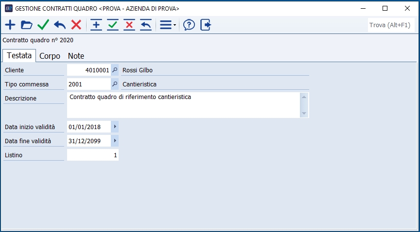 Questo programma permette di gestire i dati descrittivi di eventuali condizioni generali applicabili ai rapporti con particolari clienti. Cliente Identifica il committente delle opere cui saranno applicate le condizioni descritte. Tipo Commessa Identifica il tipo commessa per cui saranno applicate le condizioni descritte. Descrizione Fornisce una descrizione generica delle condizioni di fornitura per il contratto. Data Validità Identifica l'intervallo di inizio e fine validità per le condizioni descritte. Listino Identifica il listino prezzi di eventuali articoli specificati, che sarà applicato al cliente per le commesse che fanno riferimento al contratto quadro. Corpo Questa sezione identifica un set di dati parametrici (di tipo Testo, Data, Numero o Valore, con le relative assegnazioni), descrittivi delle condizioni applicate. Note Note descrittive delle condizioni contrattuali applicate. |