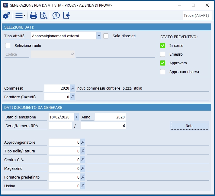 Tipo Attività Genera RDA a fronte di task di tipo "Approvvigionamento Esterno", "Lavorazioni Terzista", o entrambe le tipologie.