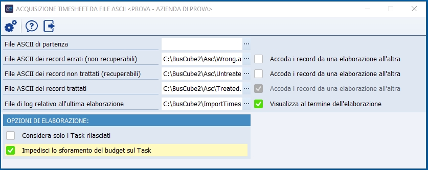 • del file ASCII dei record non trattati/recuperabili (es. per sforamento del budget sul task, oppure perché task non ancora rilasciato - tali record sono generalmente recuperabili con modifiche ai dati di commessa da Gestione commesse - ), in cui saranno inseriti i record del file ASCII da acquisire non trattati