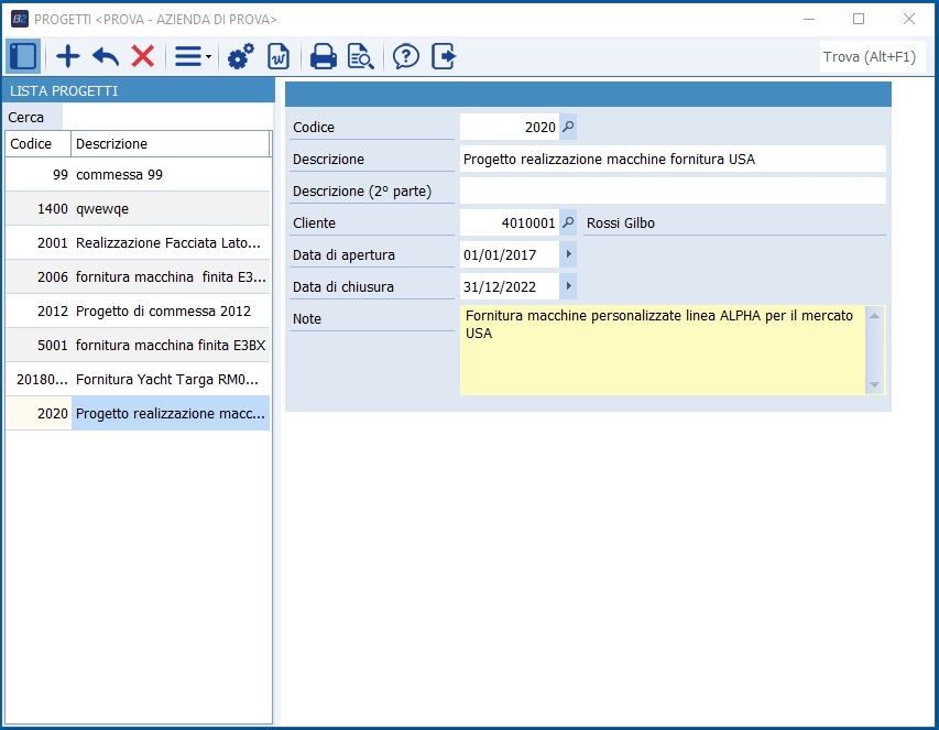 Codice / Descrizione progetto Sono il codice che identifica il progetto e la sua descrizione. Codice cliente É il codice del cliente che ha richiesto l'esecuzione del progetto. Data apertura commessa Inserire la data di apertura della commessa/progetto. Data chiusura Inserire la data di presunta chiusura del progetto. Note Campo descrittivo per l'inserimento di informazioni varie relative al progetto. |