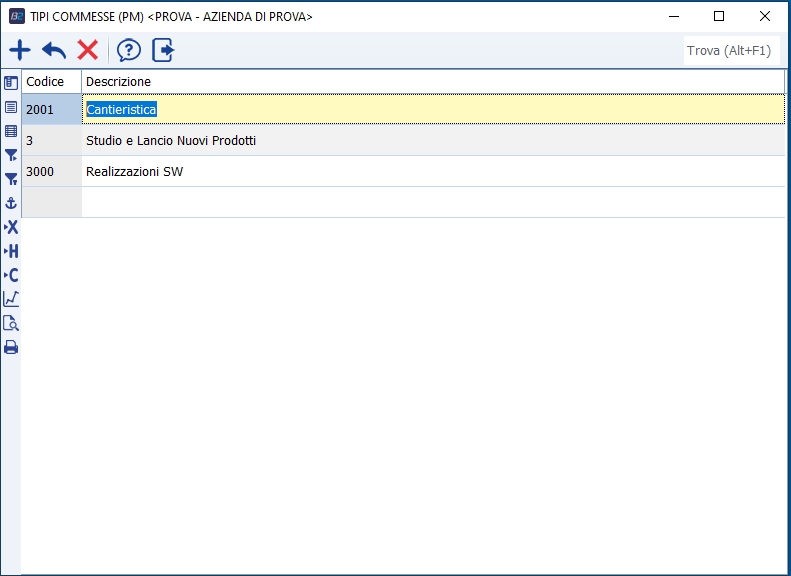 Questa tabella crea Tipi di commessa, memorizzati sulla commessa, che serviranno come filtri in fase di Stampa situazione commesse. Codice / Descrizione Inserire il codice che identificherà il tipo di commessa e la relativa descrizione. |