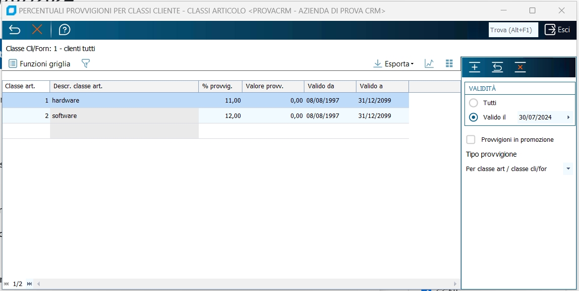 Moduli richiesti: Commerciale Avanzato Questo programma fornisce indicazioni relative a Classe provvigioni Cliente e Classe provvigioni Articolo per tutti gli agenti in un predeterminato periodo, indicazioni che non possono essere gestite diversamente, nč attraverso la Tabella Agenti, che imposta una combinazione del tipo Classe Cliente/Classe Articolo ma solo per l'agente corrente, rendendo macchinoso l'estensione della validitā di questa combinazione a tutti gli altri, nč tramite Anagrafica Clienti, in cui le indicazioni delle provvigioni sono sempre relative al cliente corrente, nč con Anagrafica Articoli, in cui le indicazioni delle provvigioni sono relative ad un solo articolo.