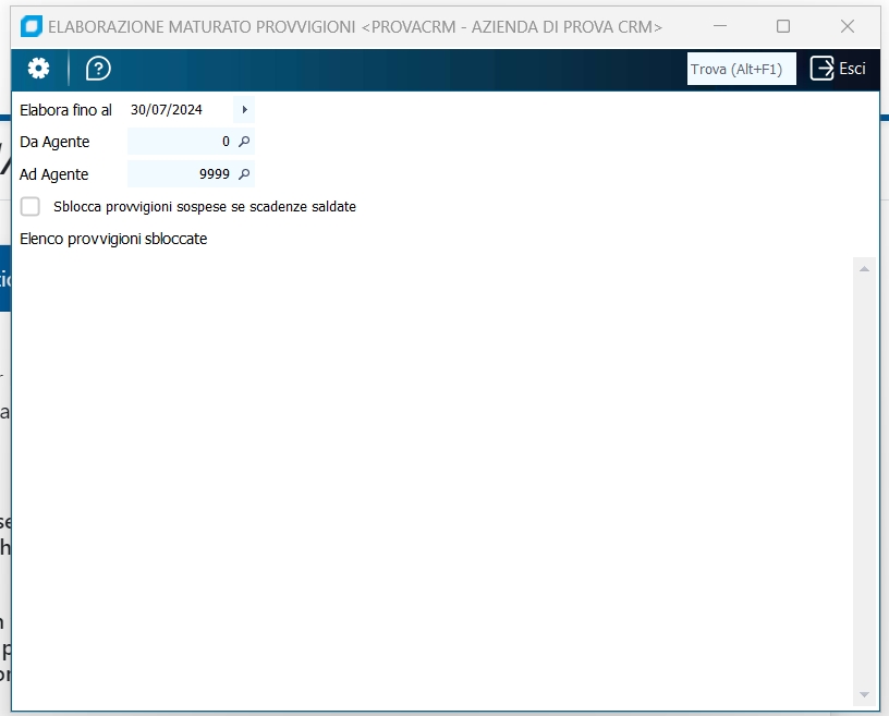 Fino al Indica fino a quale data elaborare le provvigioni già generate. Notare che essendo mancante l'estremo inferiore, Business considera tutte le provvigioni generate antecedenti alla data "Fino al" e non sospese o già corrisposte, vedi Status provvigione.
