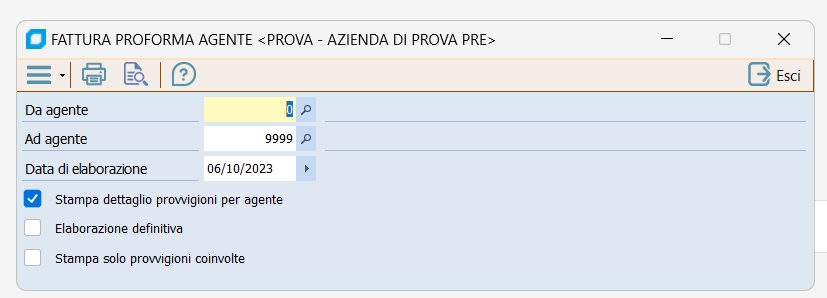 Da agente - Ad agente Tale intervallo limita la stampa delle fatture proforma ad uno o ad alcuni agenti.
