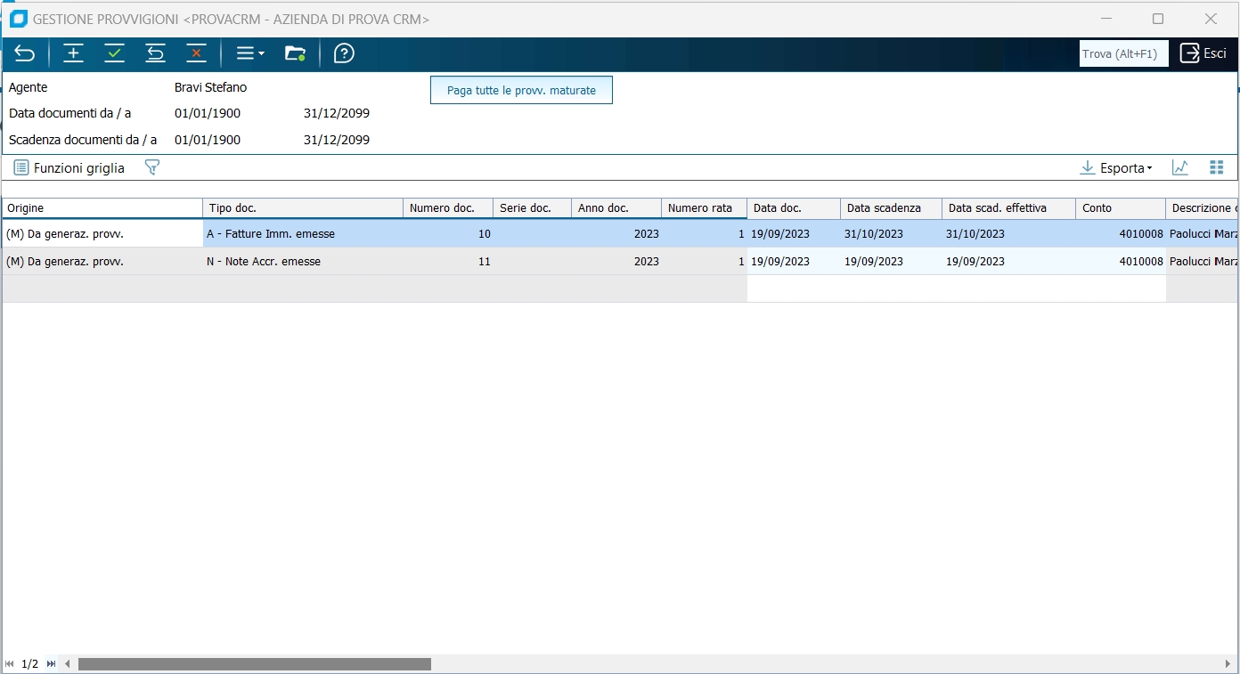 Tipo documento "A" indica una fattura immediata, "D" una fattura differita, "E"è una nota di addebito, "N" una nota di accredito e "C" è un corrispettivo. Per inserire uno storno o un importo comunque da defalcare all'agente, si consiglia di inserire un nuovo record con tipo "N" e serie "X" o una serie inutilizzata e "Origine" pari a "Integrazione o storno" o altro valore diverso da "Da generazione Provvigioni". Numero documento Indica il numero della fattura o nota d'accredito o corrispettivo. Serie del numero del documento Indica la serie associata al numero della fattura o nota d'accredito o corrispettivo. Anno documento Anno di emissione del documento. Data documento Indica la data di emissione del documento, fattura o corrispettivo. Numero rata Di norma è pari a 1. In questo campo impostiamo il numero della rata per i casi in cui le provvigioni sono liquidate sul maturato o sull'incassato, con pagamento previsto su 2 o più rate, visto che per ogni documento di questo tipo si trovano tante righe (record) quante sono le rate previste nella forma di pagamento. Data scadenza della rata Contiene la data del documento, per le provvigioni liquidate sul fatturato o sull'incassato con pagamento di tipo Rimessa diretta o bonifico. Se le provvigioni sono liquidate sul maturato o sull'incassato e il pagamento è di tipo RB o tratta, allora il campo contiene le date di scadenza delle singole rate, poiché esistono più righe di provvigione, una per rata, il cui numero dipende dalla forma di pagamento. Conto Cliente Codice relativo al cliente a cui è stato emesso il documento. Premere F5 per lo Zoom sull'Anagrafica dei clienti. Anno partita Indicare l'anno della partita a cui il documento si riferisce, spesso coincide con l'anno del documento stesso. Alfa del numero partita É l'eventuale serie della partita, a cui il documento si riferisce. Numero partita É l'eventuale numero della partita, se esistente, a cui il documento si riferisce. Totale Fattura Indica l'importo totale del documento a cui la riga si riferisce. Totale omaggi Indica l'ammontare degli omaggi presenti in fattura a storno del totale fattura, altrimenti nel caso di "Provvigioni sull'incassato" le provvigioni relative al valore degli omaggi sarebbero maturate tutte al primo lancio dell'elaborazione del maturato. Imponibile provvigione É l'ammontare dell'importo su cui è stata calcolata la provvigione, normalmente Totale fattura escluse IVA e spese. Se le provvigioni sono liquidate sul maturato o sull'incassato, il pagamento è di tipo RB o tratta e il numero delle rate è più di uno, questo importo corrisponde ad una frazione dell'imponibile provvigioni totale, in proporzione alla parte di fattura da pagarsi con quella rata. In presenza del mandato, comprende tutte le righe nella quale e' calcolata una provvigione. Importo provvigione É l'ammontare della provvigione spettante all'agente; se le provvigioni sono liquidate sul maturato o sull'incassato, con pagamento di tipo RB o tratta con più di una rata, questo importo corrisponde ad una parte della provvigione totale, in proporzione alla parte di fattura da pagarsi con la rata corrente. Maturato Ammontare della provvigione maturata, cioè pagabile all'agente, o della parte di essa. Pagato Riporta la provvigione, o la parte di essa, già liquidata all'agente per quella fattura, alla data dell'ultimo aggiornamento dei dati di periodo, attraverso la stampa della fattura proforma dell'agente in definitivo. Codice Pagamento Codice della forma di pagamento della fattura da parte del cliente. Premere F5 per lo Zoom sulla relativa tabella. Tipo Pagamento Indica il tipo generico di pagamento del documento: tratta, RIBA, Rim. Diretta, Contanti e Accr. Bancario.