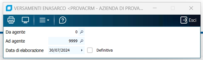 Stampa un tabulato con tante righe quanti sono gli agenti; per ogni agente sono riportati: Provvigione del periodo, Enasarco (agente + ditta) pagato nei periodo precedenti, integrazione Minimale, Importo Enasarco (agente + ditta) del periodo, Enasarco (agente + ditta) da versare effettivamente e Integrazione da recuperare nei periodi successivi.