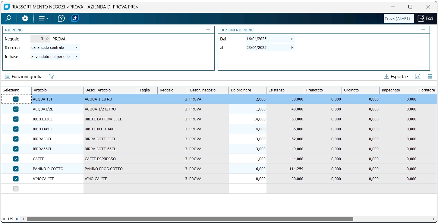 Articoli Permette di filtrare gli articoli da riassortire.
