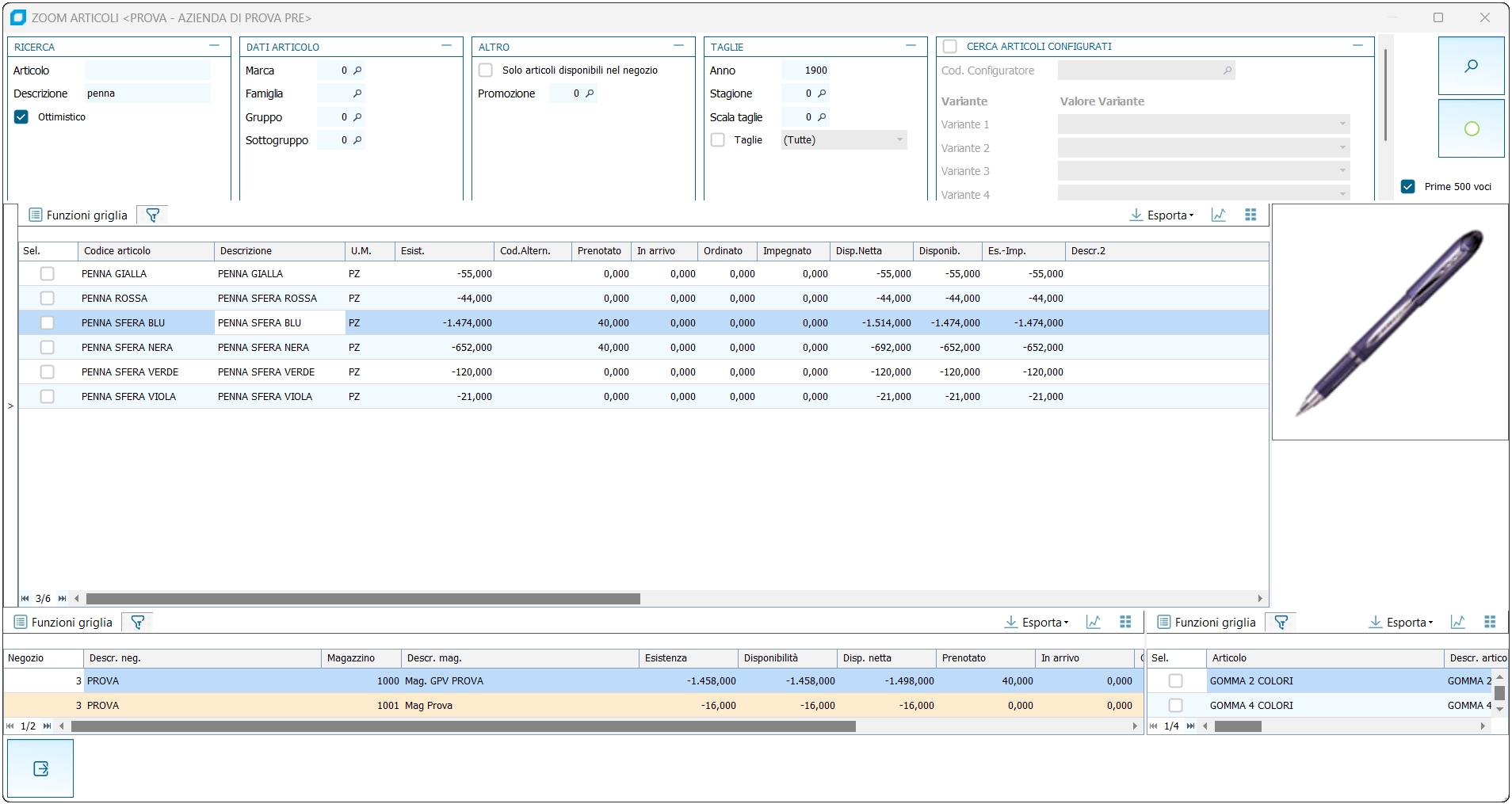 Griglia Negozi Le informazioni visualizzate sono contestuali alla riga dell'articolo selezionata; sono riportate le disponibilità dei magazzini associati al negozio e, se indicato in Personalizzazione gestione punti vendita, anche le disponibilità dei magazzini associati ad altri negozi.