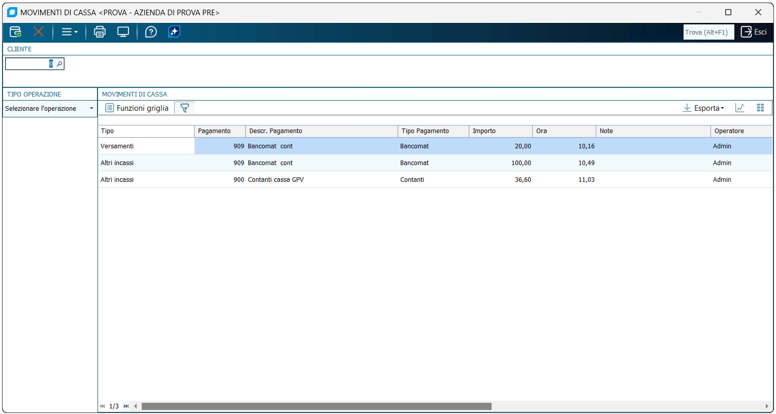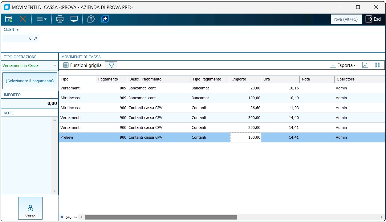 Questo programma esegue dei movimenti di cassa per far quadrare le chiusure di cassa a fine giornata. Se non selezionato il cliente, sono visualizzati tutti i movimenti di cassa inseriti nell'ultima apertura di cassa.