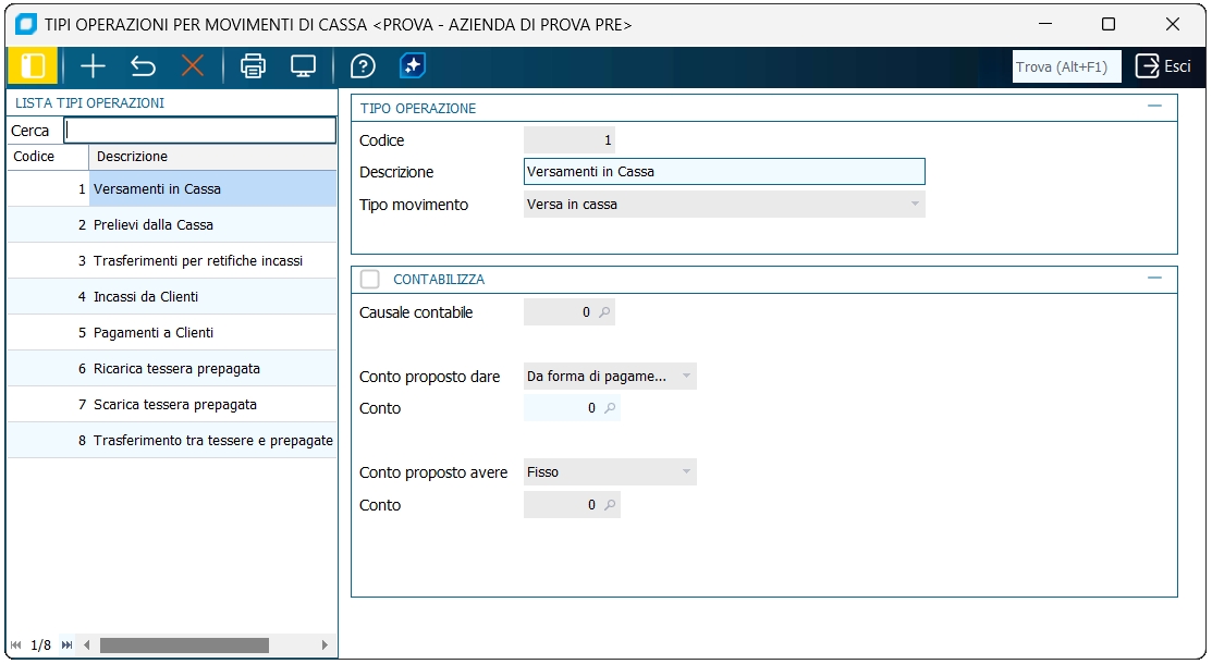 Tipo Operazione Inserito il cliente, è possibile scegliere dall'apposita tendina il tipo di operazione da effettuare; questi vanno creati dal programma "Tipi operazioni per movimenti di cassa", a meno che non si indichi di effettuare un versamento in cassa o un prelievo.