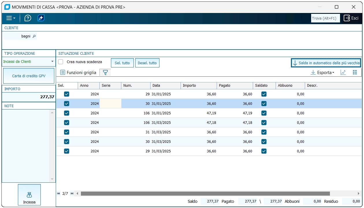 Incasso Cliente Se selezionato, è possibile incassare eventuali crediti clienti; la funzionalità dovrà essere abilitata da Personalizzazione Gestione Punti Vendita. Selezionata la forma di pagamento e dato un importo, potranno essere saldati manualmente (indicando l'importo sulla riga corrispondente e spuntando la voce Saldato), oppure in automatico partendo dalla registrazione più vecchia.
