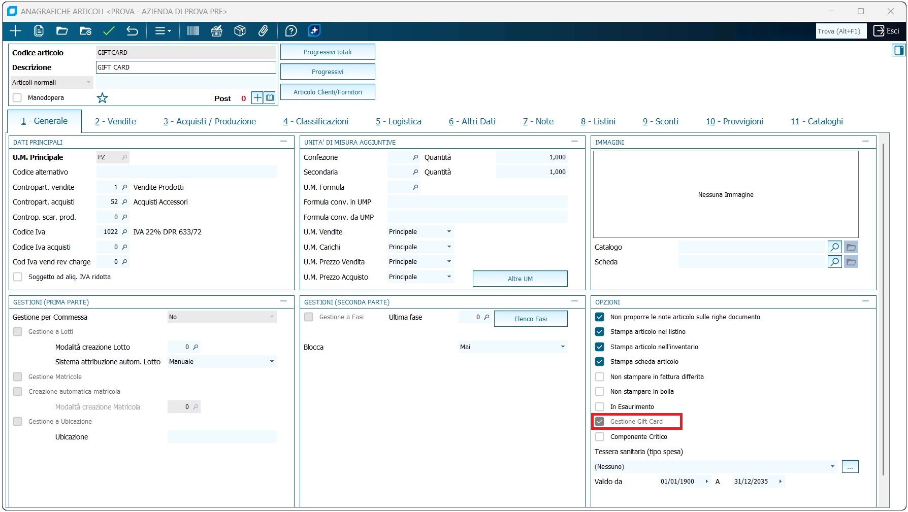 2) Creare un nuovo articolo e attivare la gestione delle "Gift Card" (no articoli a variante e Taglia & Colori)
