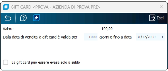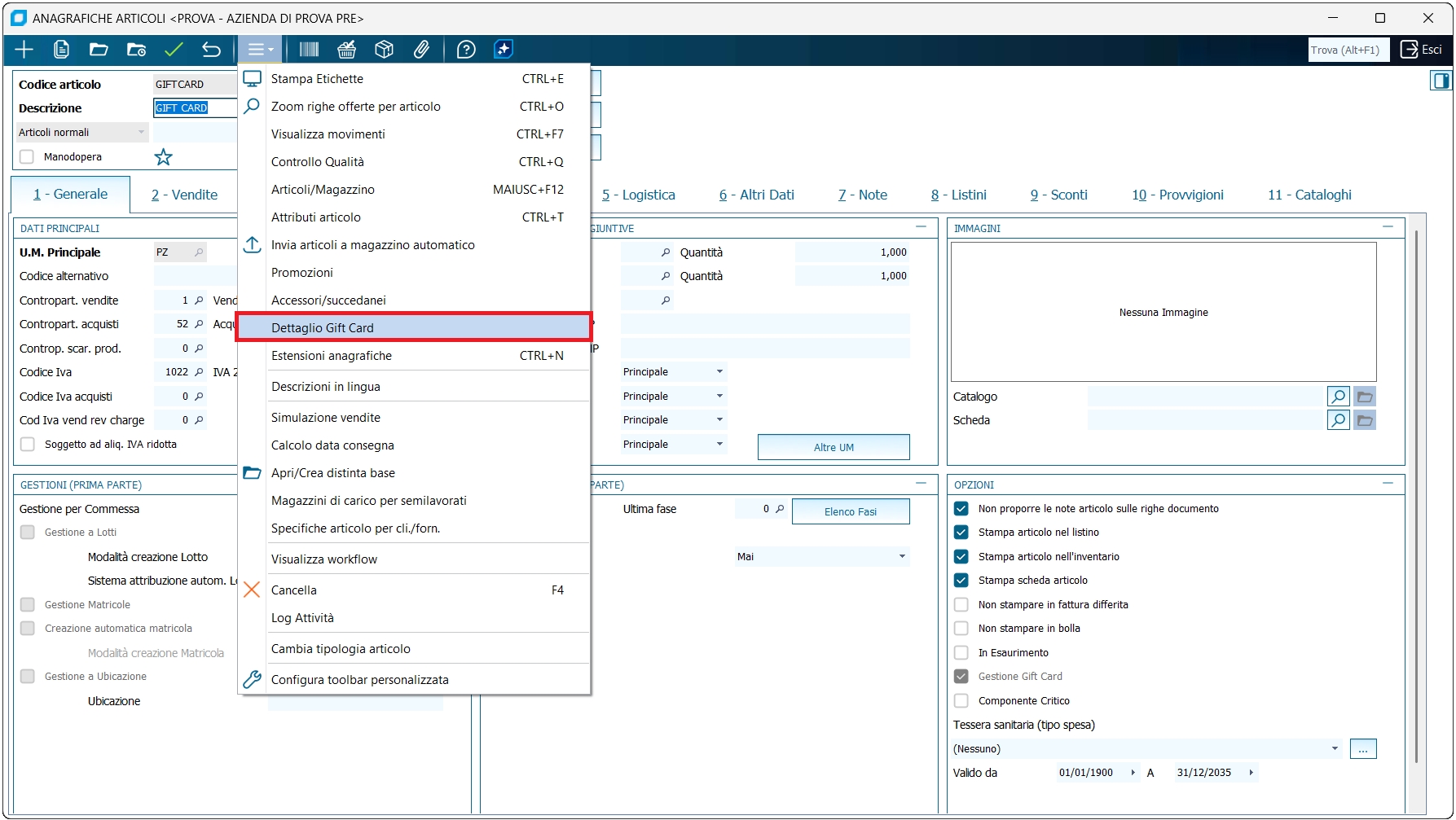 3) Dopo aver salvato l'articolo richiamare dal Menu Strumenti il "Dettaglio Gift Card", in questa maschera è possibile indicare: