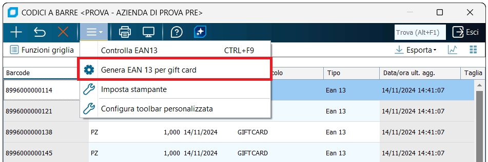 4) Associare all'articolo appena creato i codici a barre che corrisponderanno alle card vere e proprie, è possibile inserirli manualmente o generarli in automatico tramite l'apposita funzione "Genera EAN 13 per gift Card" presente nel menu strumenti.