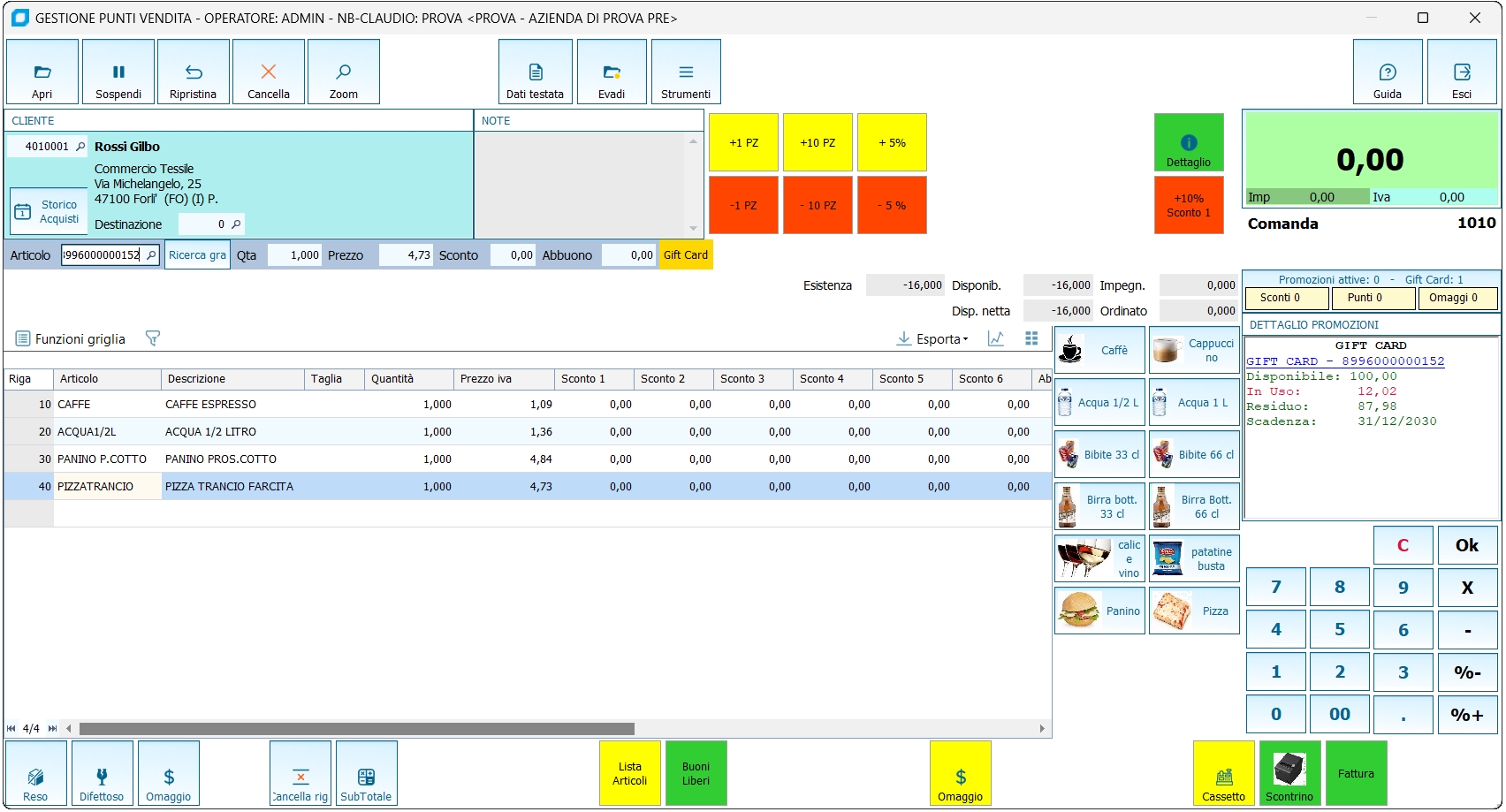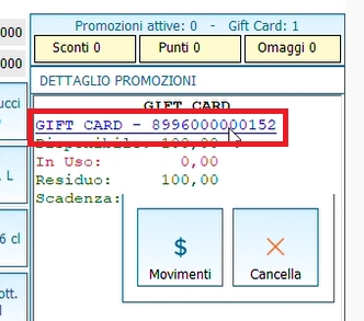 In fase di vendita per poter utilizzare il credito della Gift Card è necessario prima di selezionare gli articoli, inserire il codice a barre corrispondente alla card, in questo modo verrà visualizzato in maschera il dettaglio del credito della Gift Card che si aggiornerà in automatico tutte le volte che viene aggiunto un articolo nel corpo del documento. NB: la maschera del dettaglio gift card è richiamabile dal "Menu Strumenti" oppure cliccando sul nome delle card visibile nel "Dettaglio promozioni".
