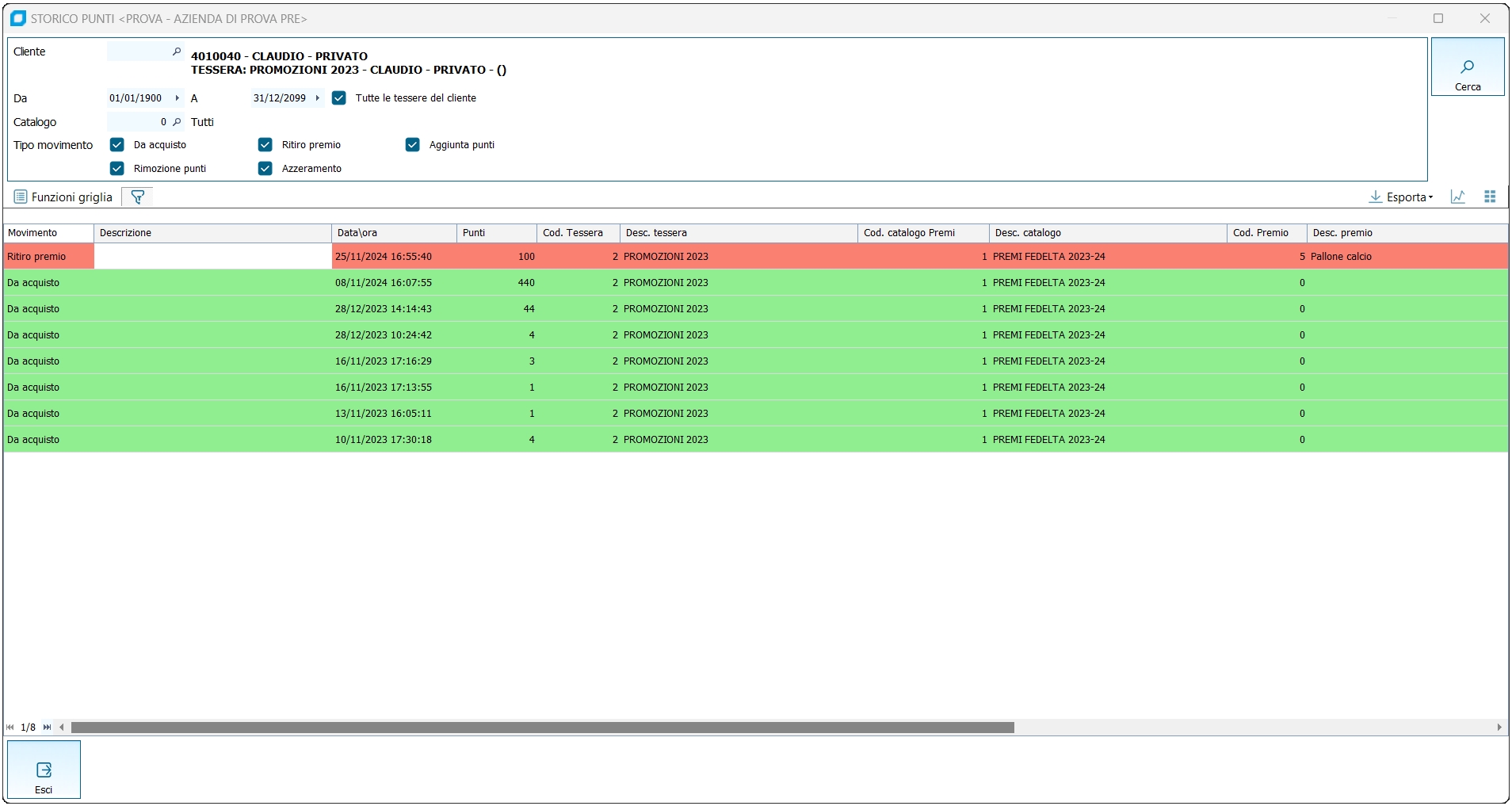 Moduli richiesti: Gestione Punto Vendita Extended Questo programma permette di visualizzare l'archivio di tutti i movimenti punti di un determinato cliente distinti per tipo movimento, la maschera è richiamabile dal Menu Principale e dall' Anagrafica Clienti.