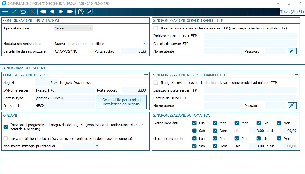 Questo programma permette di effettuare la configurazione iniziale per poter gestire lo scambio dei file tra Sede principale e Negozi (Modalità Disconnessa), la maschera è suddivisa in 3 sezioni ed è configurabile solo dall'installazione server o sede centrale: