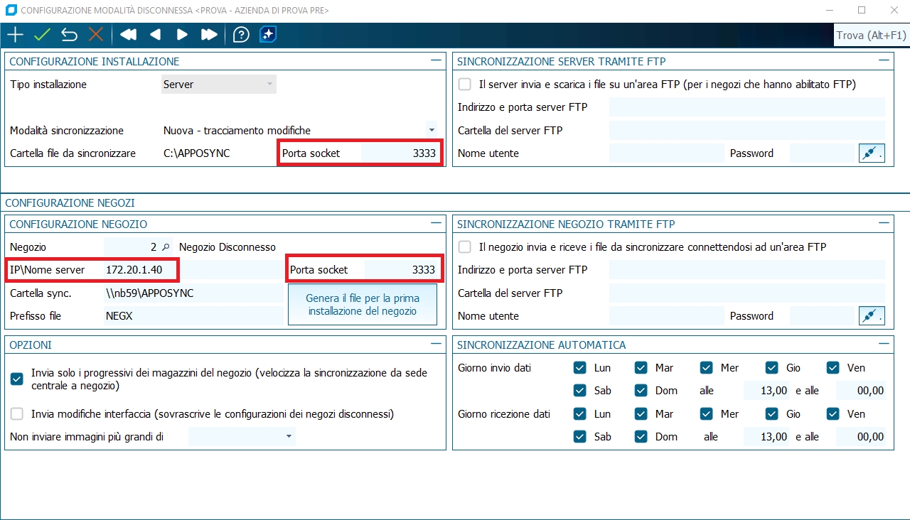 Innanzitutto assicurarsi che il server sia raggiungibile dal negozio inserendo l'indirizzo IP corretto nell'apposito campo della maschera di configurazione (se indicato il nome del server non devono essere anteposte le "\\") e deve essere indicata la stessa Porta Socket sia per la sede centrale che per il negozio.
