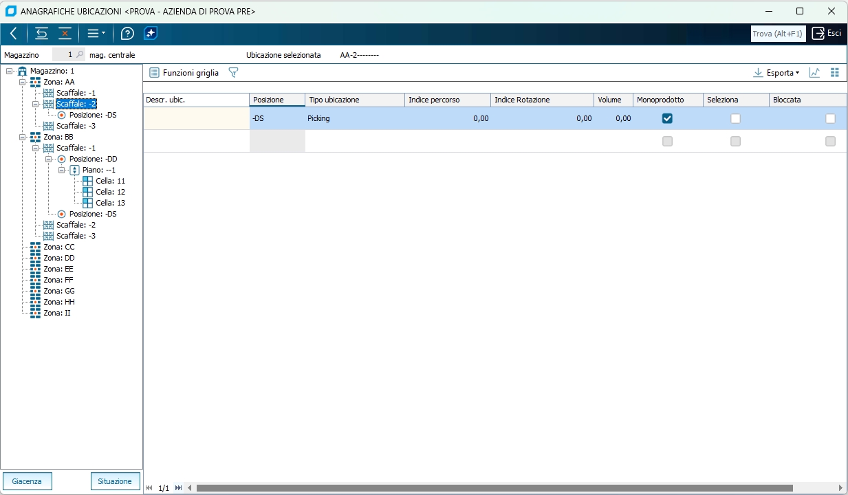 All'apertura del programma il campo magazzino è sbloccato e permette di scegliere il magazzino sul quale si vuole lavorare. Dopo aver scelto il magazzino appare la vista delle ubicazioni. Per tornare alla scelta dei magazzini è necessario premere il tasto ripristina. Nella lista delle ubicazioni viene riportata la struttura delle ubicazioni tramite un albero a nodi. Il pulsante giacenza serve per avviare il programma di giacenza nelle ubicazioni. Il pulsante situazione avvia il programma di situazione disponibilità nelle ubicazioni. Nella griglia viene mostrata la colonna Zona, Scaffale, Posizione, Piano o Cella in base a quale nodo abbiamo selezionato nella lista delle ubicazioni e rappresenta la codifica che viene assegnata all'ubicazione. Aggiungendo una nuova riga nella griglia verrà creato un nodo figlio all'interno della lista delle ubicazioni. In Tipo ubicazione è possibile scegliere tra Picking, Stock, Altro e indica a quale scopo è designata la specifica ubicazione. Il valore viene ereditato dal nodo padre ed è naturalmente possibile modificarlo in ogni momento anche sui figli. Se attiva l'opzione di registro BSRMPICK\OPZIONI\ConsideraUbicStock, in fase di riscontro di un picking, in mancanza di disponibilità merce sull'ubicazione di tipo PICKING (anaubic.au_tipo = 'P'), allora verranno prese in considerazione anche le ubicazioni di tipo STOCK.