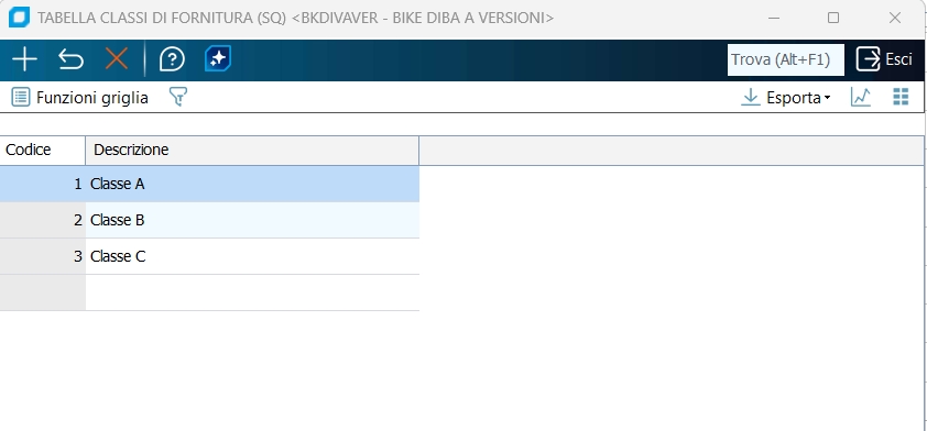 Codice Codice identificativo della classe di fornitura. Descrizione Descrizione da assegnare alla classe di fornitura. |