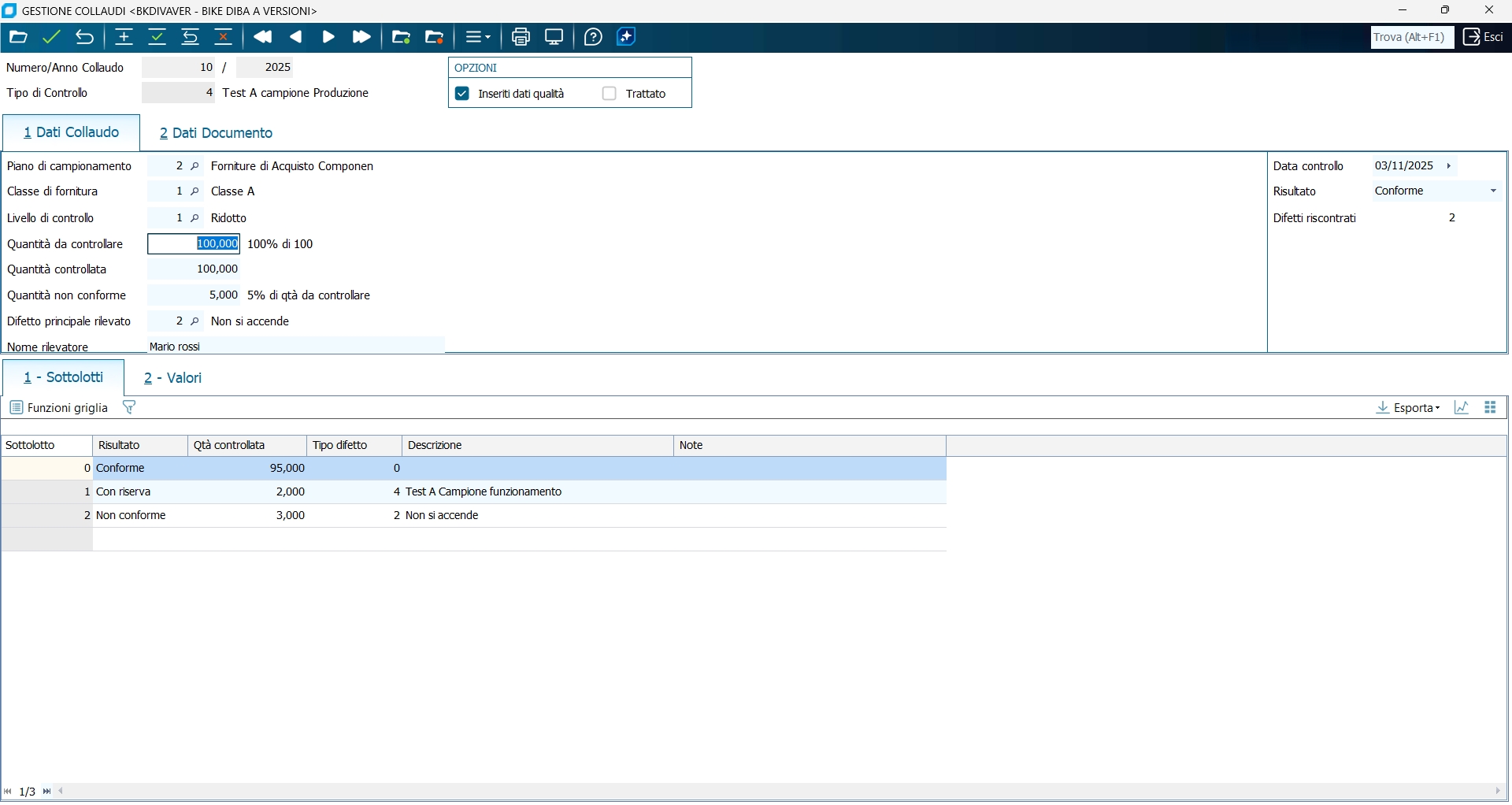 Nella parte superiore della schermata sono evidenziati gli estremi del collaudo (numero e anno collaudo) e il tipo di controllo da eseguire come impostato da "Collaudi di Qualità".