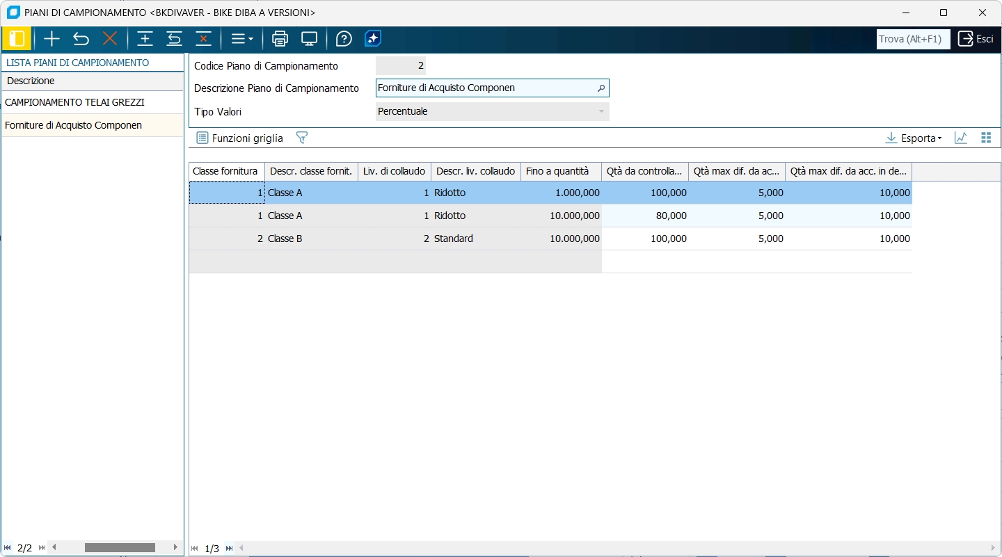 Mediante questo programma è possibile inserire i vari piani di campionamento, in base alla classe di fornitura ed al livello di controllo.