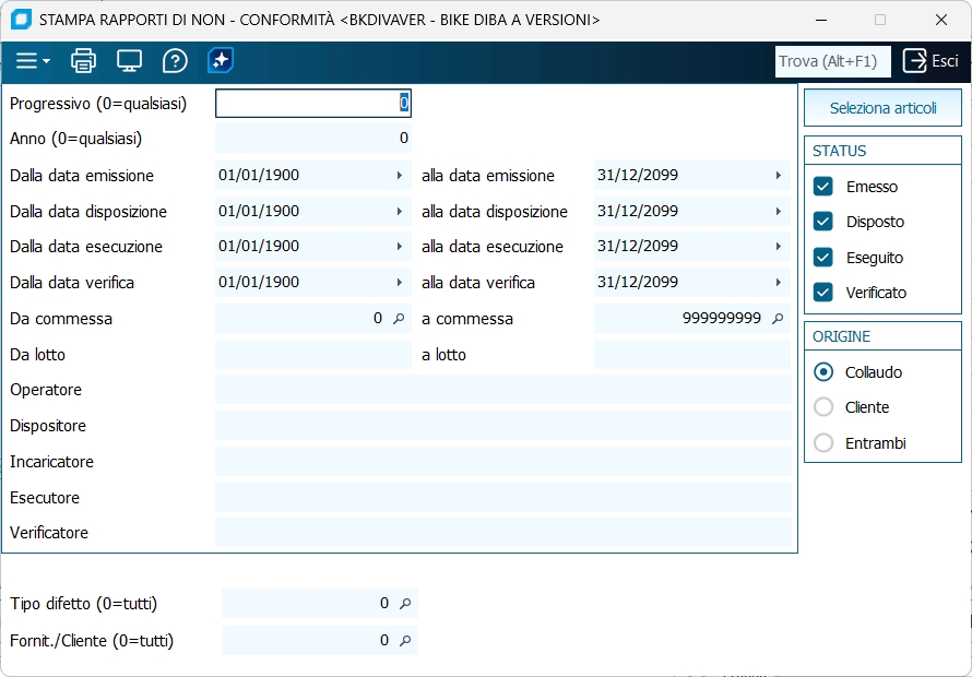 Questo programma permette di eseguire stampe di controllo sui rapporti di non conformitą. I vari filtri permettono di limitare la stampa/visualizzazione ai soli dati che interessano al momento.
