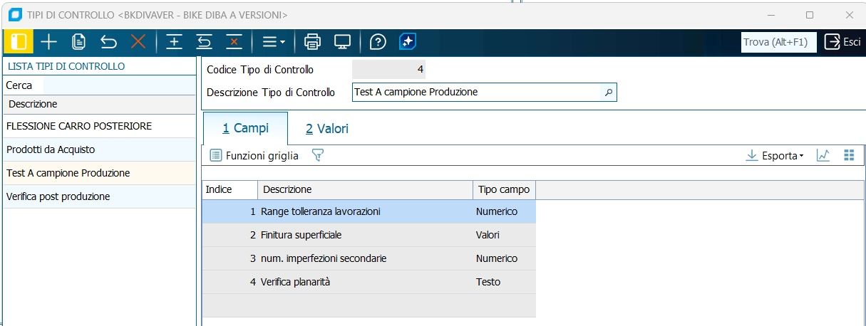 Valori: in fase di compilazione scheda collaudo occorre selezionare una voce da un elenco a discesa.