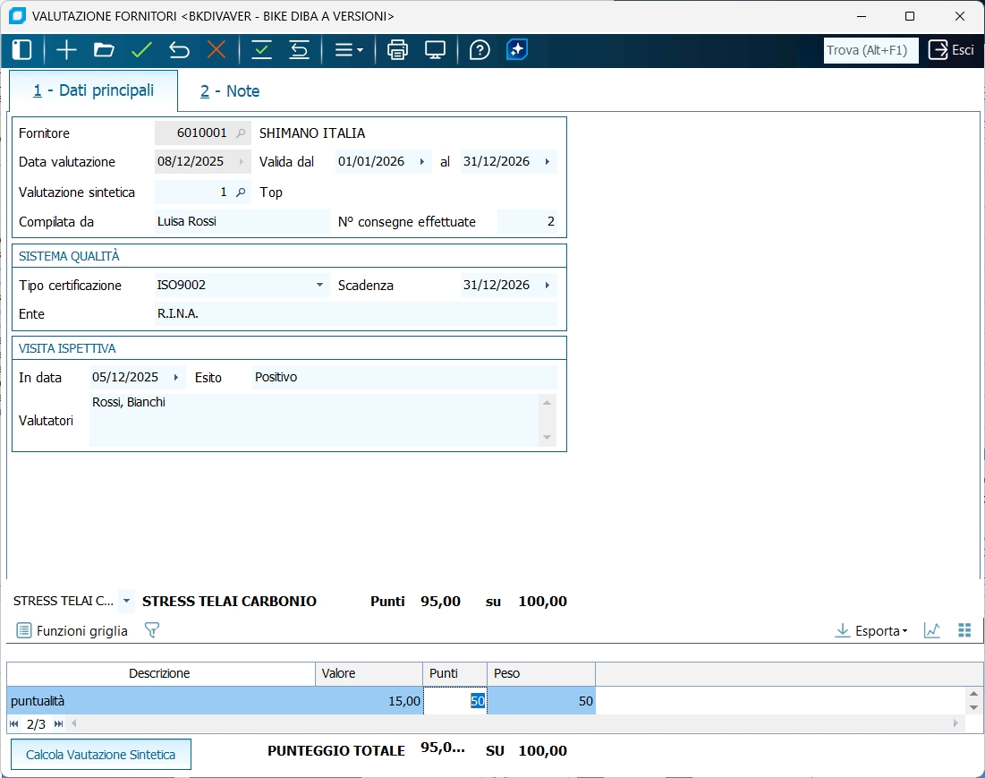 Questo programma permette di eseguire una valutazione sintetica dei fornitrori, nonchè di mantenere un archivio aggiornato della situazione dei singoli fornitori in termini di visita ispettiva e sistema di qualità acquisito.