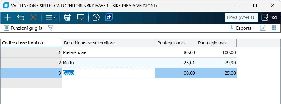 Codice classe fornitore Inserire il codice che identifica la classe fornitore. Descrizione classe fornitore Inserire la descrizione da assegnare alla classe fornitore. Punteggio minimo Inserire il punteggio minimo che un fornitore deve avere per rimanere nella classe in analisi. Punteggio massimo Inserire il punteggio massimo che il fornitore deve raggiungere per ottenere una promozione. |