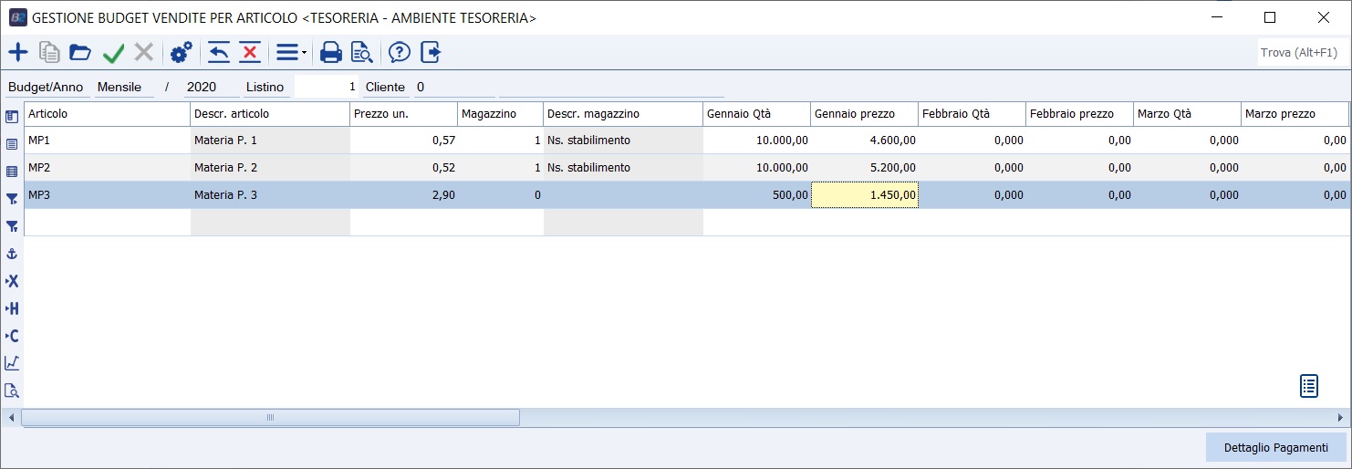 L'archivio è unico, pertanto gli stessi dati inseriti qui possono essere visti/modificati anche nel programma "Gestione Budget di vendita" o viceversa (se si tratta di budget mensili). Listino Indicare quale listino considerare per proporre il prezzo di vendita da indicare in griglia. Cod. articolo Indicare il cod. dell'articolo. Prezzo unitario S'intende il prezzo di vendita, proposto in base al listino indicato sopra. Non è memorizzato nel budget, serve solo ad agevolare l'inserimento dei valori a budget; il programma moltiplica questo dato con la quantità indicata per ricavare il valore a budget. Cod. Agente Solo se prevista la distinzione per agente, indicare il codice agente Cod. magazzino Solo se prevista la distinzione per magazzino/deposito, indicare il codice magazzino. Quantità gennaio Indicare la quantità prevista di vendita per il mese di gennaio dell'anno indicato in precedenza.