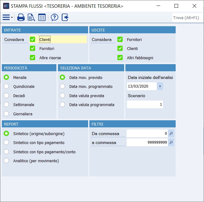• Sintetico (origine/sub-origine): fornisce dati sintetici di entrate ed uscite, distinte per origine clienti, fornitori, altri fabbisogni, altre risorse e sub-origine (per i clienti, scadenzario clienti, portafoglio clienti, fatture da emettere, ordini clienti, budget di vendita; per i fornitori, scadenzario fornitori, fatture da ricevere, ordini fornitori, proposte d'ordine fornitori; per gli altri fabbisogni movimenti finanziari passivi previsti per conto di uscita; per le atre risorse: cassa, conti correnti attivi, movimenti finanziari previsti attivi per conto di entrata)