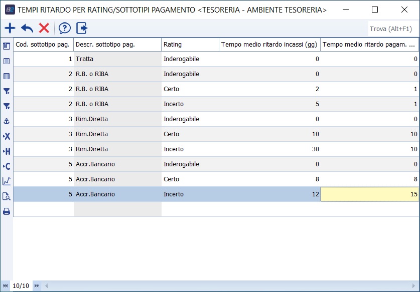 Questa tabella permette di definire, per ogni combinazione di Tipo pagamento/Rating cliente, dei giorni di ritardo di incasso/pagamento che aggiunti alla data di scadenza originaria, va a determinare la data prevista di incasso/pagamento.