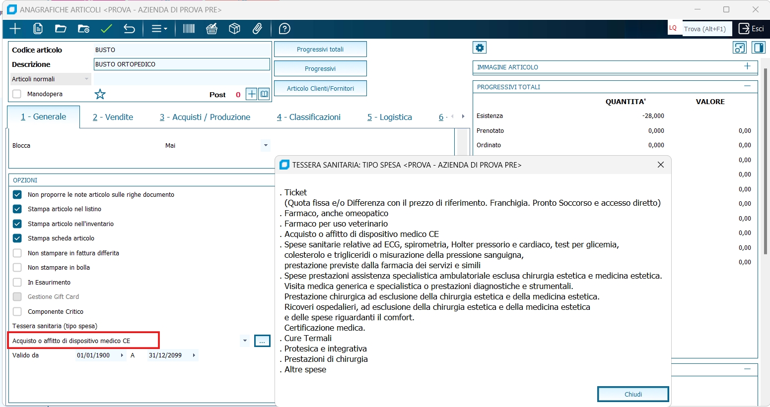 Per le spese che sono oggetto di comunicazione al STS va indicato nell'anagrafica articoli il tipo Spesa Tessera Sanitaria affinchè vengano estratte dal programma di Gestione Tessera Sanitaria