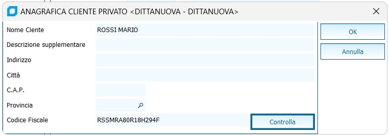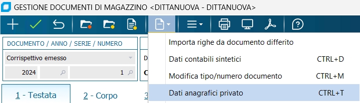 A standard vengono estratti solo i dati di documenti intestati a clienti privati ma è presente l'opzione di registro BSTSGSTS/OPZIONI/EstraiAziende che se attiva a -1, permette l'estrazione dati anche dei soggetti aziende (an_privato = 'N'). I documenti di tipo Corrispettivi emessi devono essere intestati a Cliente privato generico . Inoltre deve essere indicato il codice fiscale dell'acquirente nell'apposito campo DA menù Testata\Dati anagrafici privato