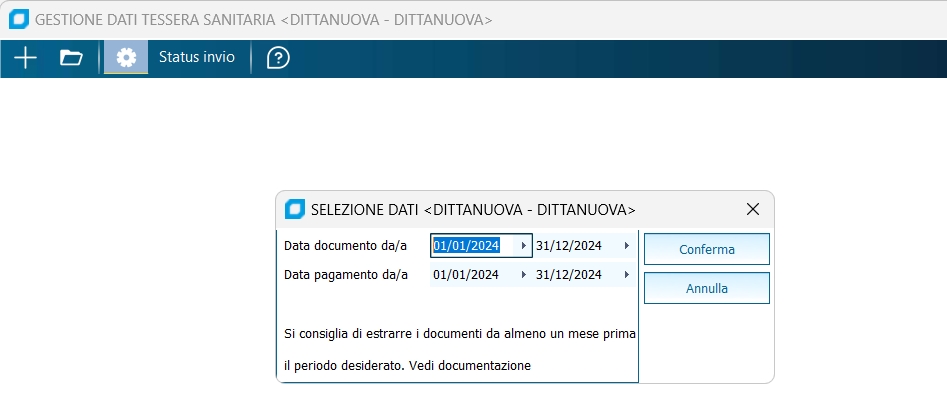 Nell'estrazione dati è possibile filtrare per data documento e per data pagamento\incasso. Con i nuovi interventi svolti è possibile estrarre i dati di documenti relativi ad anni diversi dalla data del pagamento ed è possibile estrarre da magazzino anche documenti con data emissione relativa a più anni. Dall'anno 2021 l'adempimento é mensile. Si consiglia quindi di estrarre indicando in data pagamento dalla Data alla Data il mese di riferimento di cui si deve fare l'adempimento Invece nei campi Data documento da/a indicare un intervallo di date di almeno un mese prima in modo che siano selezionate fatture emesse in mesi precedenti ma saldate nel mese di cui si deve fare l'invio