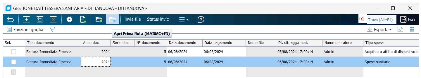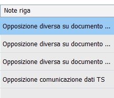 La colonna Note Riga è sempre alimentata e può contenere tre valori: 1) Documento relativo eliminato (se non esistono più i riferimenti al documento di magazzino) 2) Opposizione comunicazione dati TS (se nel documento collegato, successivamente all'estrazione, è stato selezionato il CheckBox "Opposizione alla comunicazione dei dati della Tessera Sanitaria") 3) Documento OK (se la riga è collegata ad un documento esistente)